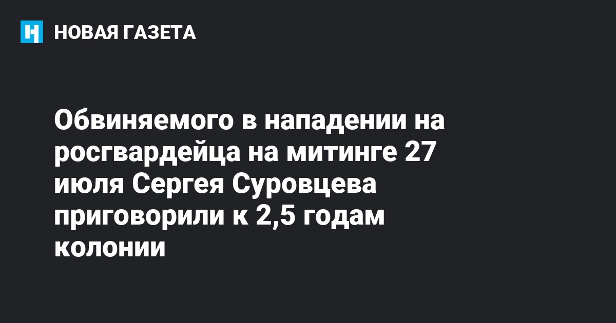 Тверской суд Москвы приговорил к 2 годам 6 месяцам колонии фигуранта «московского дела» Сергея Суровцева, обвиняемого в нападении на росгвардейца на акции 27 июля (ч. 1 ст. 318 УК). Об этом сообщает корреспондент «Новой газеты» из зала суда.