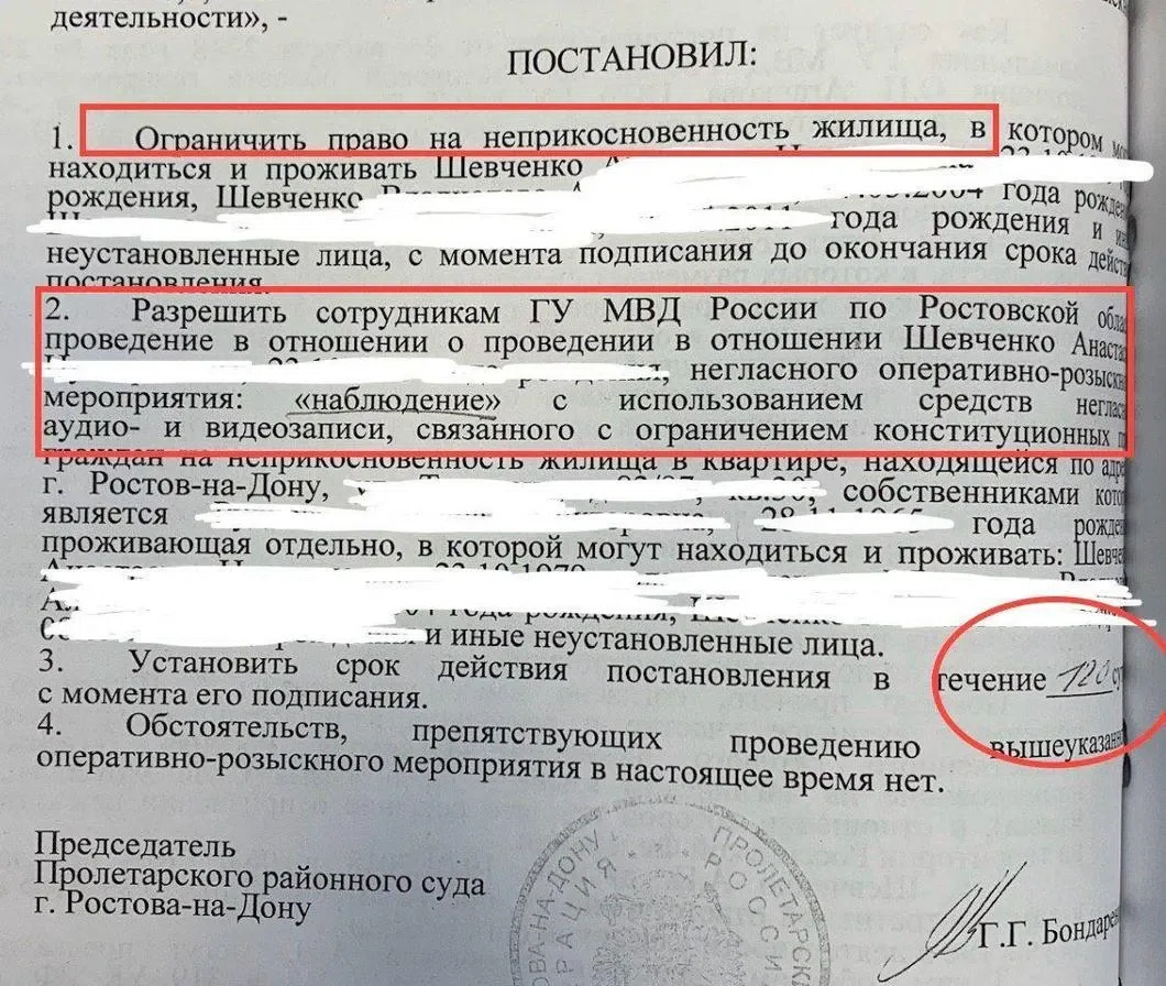 Пролетарский суд Ростова-на-Дону 30 августа 2018 года удовлетворил ходатайство сотрудников Центра противодействия экстремизму и частично лишил Анастасию Шевченко права на неприкосновенность личной жизни. По требованию оперативников в спальне ее съемной квартиры была установлена скрытая видеокамера, и на протяжении пяти месяцев, вплоть до задержания активистки 20 января 2019 года, сотрудники Центра «Э» наблюдали и фиксировали перемещение молодой женщины по спальне, включая те моменты, когда на ней не было пижамы.