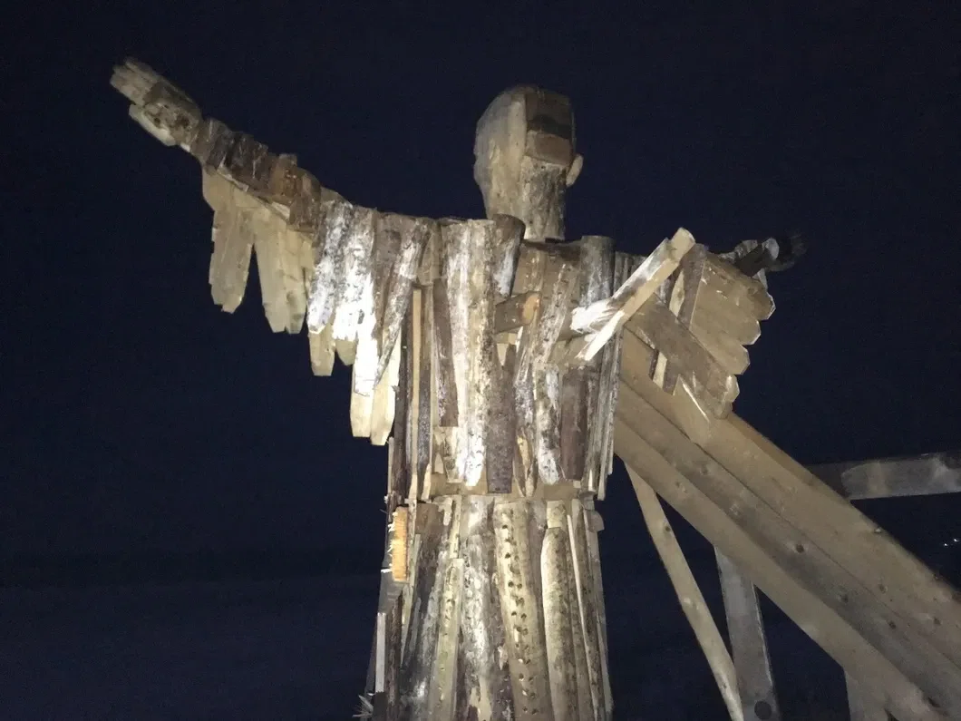 — Это самое красивое, что есть в нашей деревне, — говорит добровольный смотритель памятника Андрей Викторович. Он ездит на «буханке» — больше ни одна машина не справится с местным бездорожьем. Когда Древарх эмигрировал, с его сосновой копии исчезли крылья. Не нашли даже следов. Кто и куда уволок — неведомо. Весной жители обещают сделать новые, большие и белые. А Саша Менухов говорит, что хотел бы такую скульптуру поставить в самом Архангельске, но местные чиновники не согласовали ему еще ни один объект. Так что, увидеть его скульптуры проще в норвежском Киркенесе или на европейских биеннале. Вот теперь еще и в Брин-Наволоке.