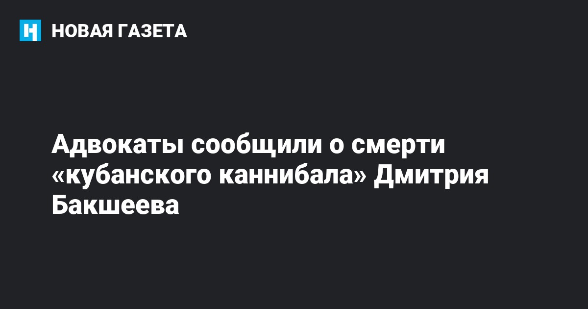 В Ростове-на-Дону умер Дмитрий Бакшеев, известный как «кубанский каннибал». Об этом «Новой газете» сообщила его защитник Юлия Федотова. Аналогичной информацией располагает адвокат Алексей Аванесян.