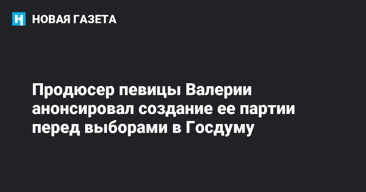 Певица Алла Перфилова, известная под псевдонимом Валерия, может создать партию перед выборами в Госдуму в 2021 году. Об этом «Новой газете» сообщил продюсер артистки Иосиф Пригожин.