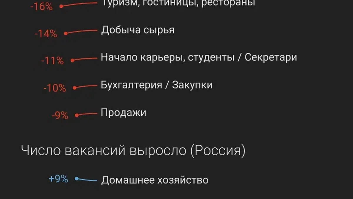 По России ситуация чуть лучше — число вакансий снизилось не так резко (на 3%), а в некоторых сферах даже выросло.