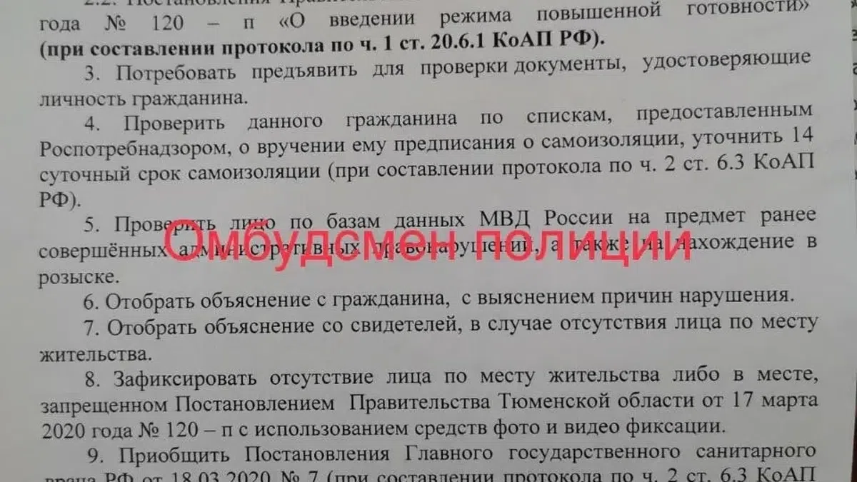 Случай с доктором Куропаткиным, вероятно, не единственный. Общих правил или каких-то памяток для сотрудников полиции в период борьбы с коронавирусом МВД не разработало. Тоже отдали на откуп регионам. Телеграм «омбудсмена полиции» опубликовал ««Алгоритм действия сотрудников органов внутренних дел», принятый в Тюмени для нарушителей самоизоляции.