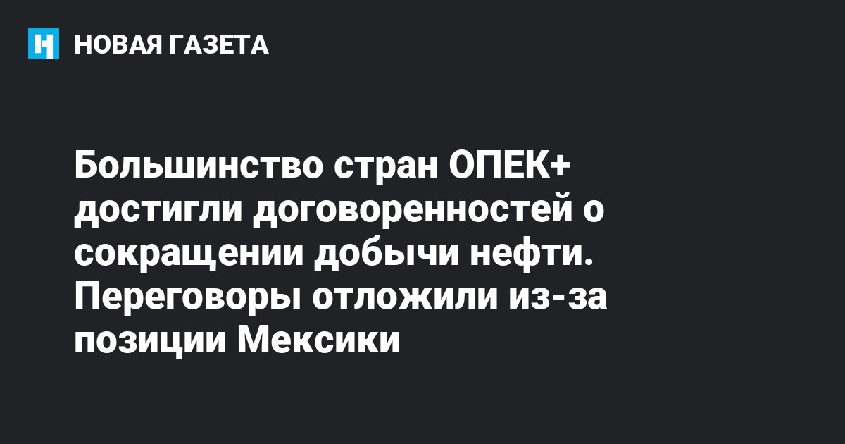 Большинство стран ОПЕК+ договорились о сокращении объемов добычи нефти на 10 миллионов баррелей в сутки, однако о сделке пока не объявляют из-за позиции Мексики. О результатах переговоров, которые длились более 10 часов и, вероятно, продолжатся сегодня, сообщает агентство Bloomberg.