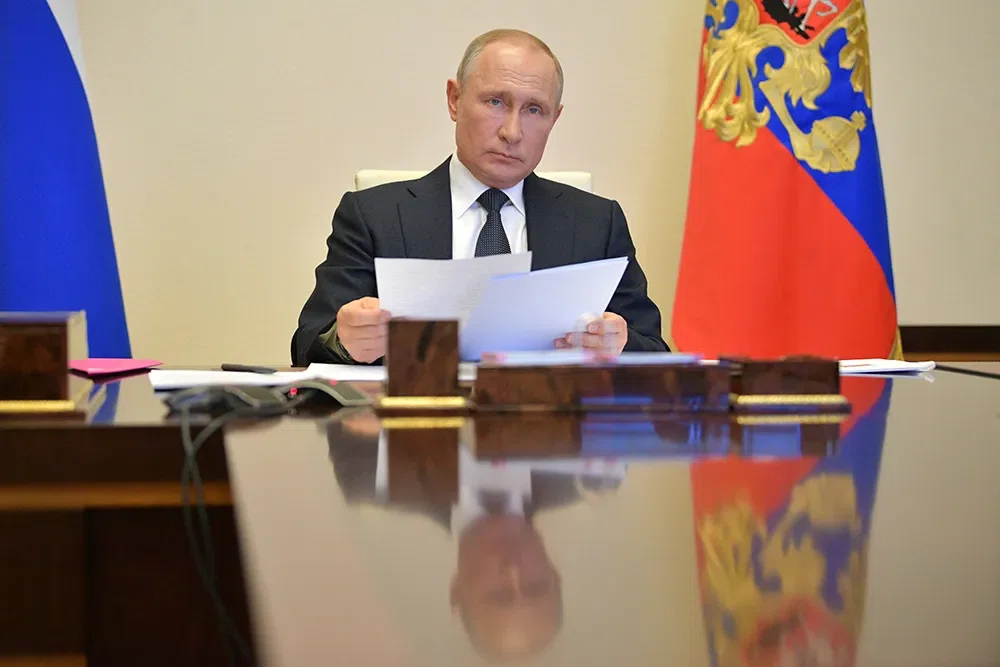 Владими Путин проводит онлайн-совещание по вопросу о санитарно-эпидемиологической обстановке. Фото: Алексей Дружинин / ТАСС