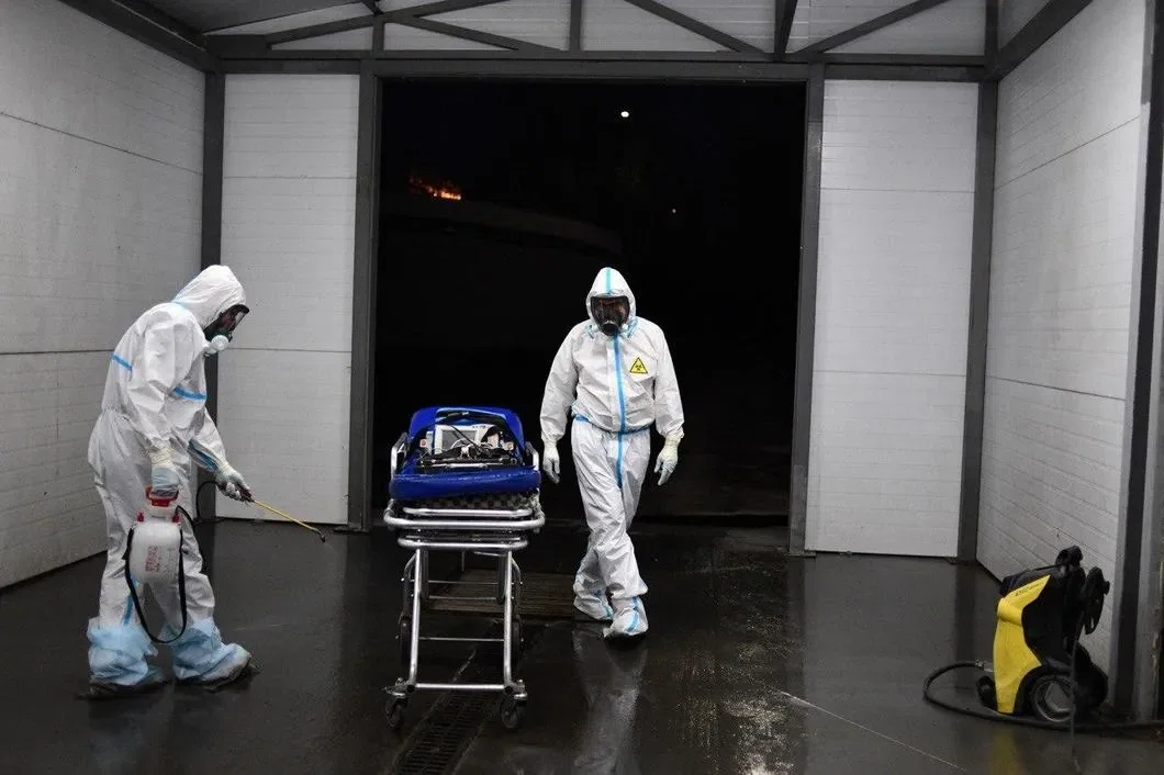 На улице светло. Вдали дезинфекционная машина — женщины в белых комбинезонах поливают асфальт раствором.