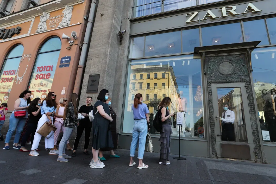 У двухэтажного магазина Zara на Невском растянулась очередь из десятков людей. С 8 июня в Петербурге разрешена работа непродовольственных магазинов, которые расположены вне торговых центров. С оговоркой: один человек на 4 квадратных метра.