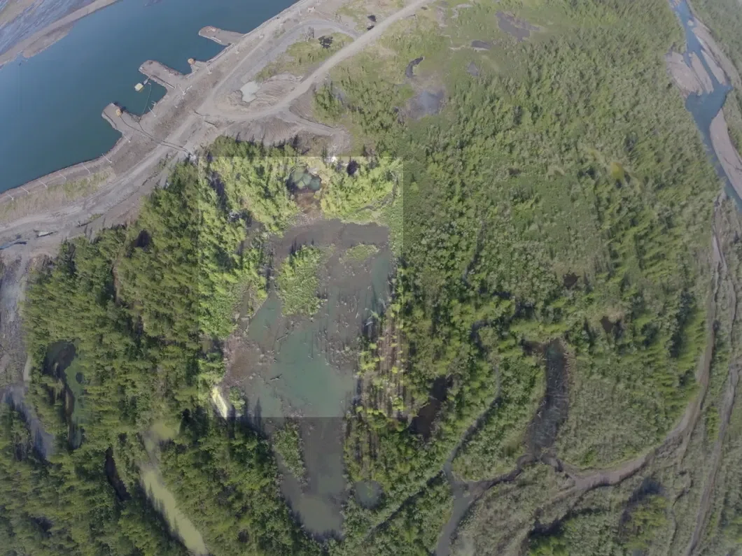В выделенной области — новое широкое русло в лесном массиве, пробитое сбрасываемыми отходами. Лазурный разлив — это «мертвое озеро».