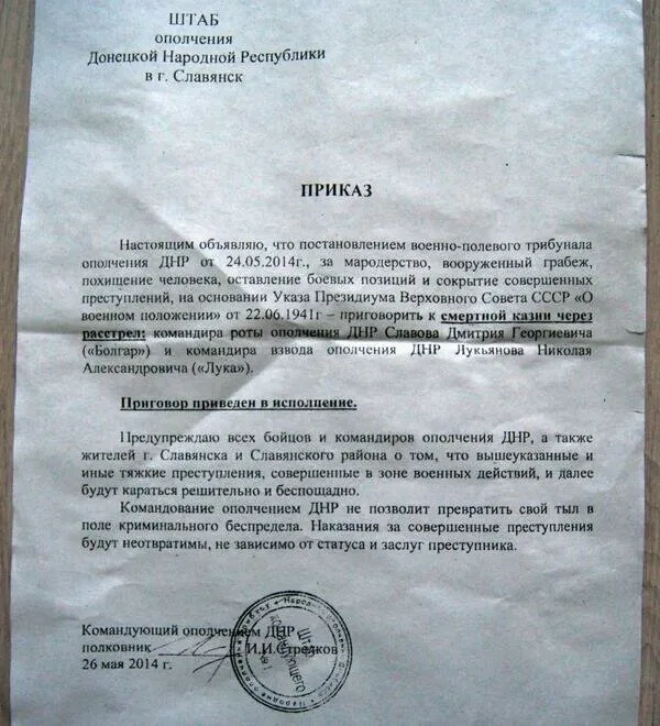 «В тот момент я был в Донецке, но когда увидел приказ [Стрелкова], был шокирован, это был фарс по поводу трибунала 41 года. (…) Я провел беседу со многими сослуживцами Болгара и Луки. Их туда послали не убивать, они что-то должны были проверить, и они там никого не убивали, они взяли оттуда продукты и теплые вещи, это им вменили как мародерство. Кто-то эту информацию преподнес Стрелкову. По поводу женщины — там была другая история, кто-то дал информацию о якобы наркоторговле в доме цыганского барона. Когда туда зашли, там начали отстреливаться, тогда действительно ранили женщину, но ее спасли. На самом деле барон уже не жил лет восемь в этом доме, там жила порядочная семья».