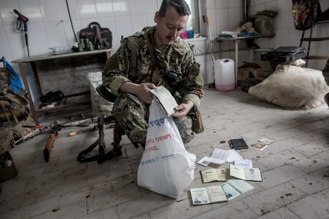 Про возможный расстрел водителя грузовика «Новой почты», того, что вез «яблоки», Стрелков говорит, улыбаясь: «И да, и нет». Стрелков отказался назвать людей, которые его встречали, утверждая, что они сейчас на передовой. Действовал он при финансовой поддержке Аксенова. Вторым человеком, который оказал поддержку, был [Константин] Малофеев («православный» российский предприниматель, владелец телеканала «Царьград», входит в близкий круг общения Сергея Глазьева. — Ю. П.): «Форма была закуплена на деньги Малофеева еще для крымского батальона, она просто не успела в Крым, мы ее успели получить буквально за день до перехода в Ростове. То же самое касается обуви, то же самое касается снаряжения, насчет всего остального я отвечать не буду».