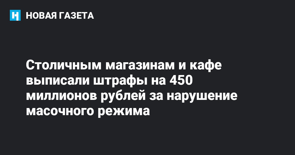 В Москве кафе, рестораны и продуктовые магазины получили штрафы на общую сумму 450 миллионов рублей из-за несоблюдения перчаточного и масочного режима, введенного для профилактики коронавируса. Об этом ТАСС сообщили в пресс-службе столичного департамента торговли и услуг.