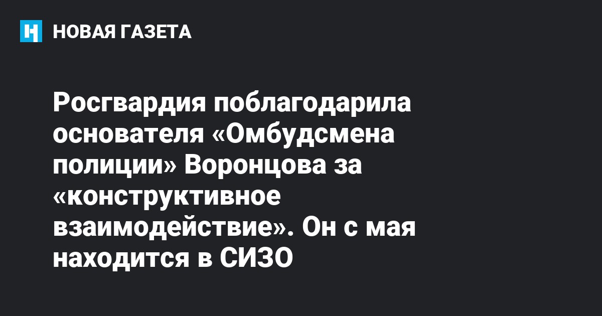 По словам источника агентства, в Росгвардии заявили, что выражают Воронцову «признательность за сотрудничество с проектом "Омбудсмен полиции"», которое позволило «доводить до сведения общества объективную информацию о деятельности ведомства».