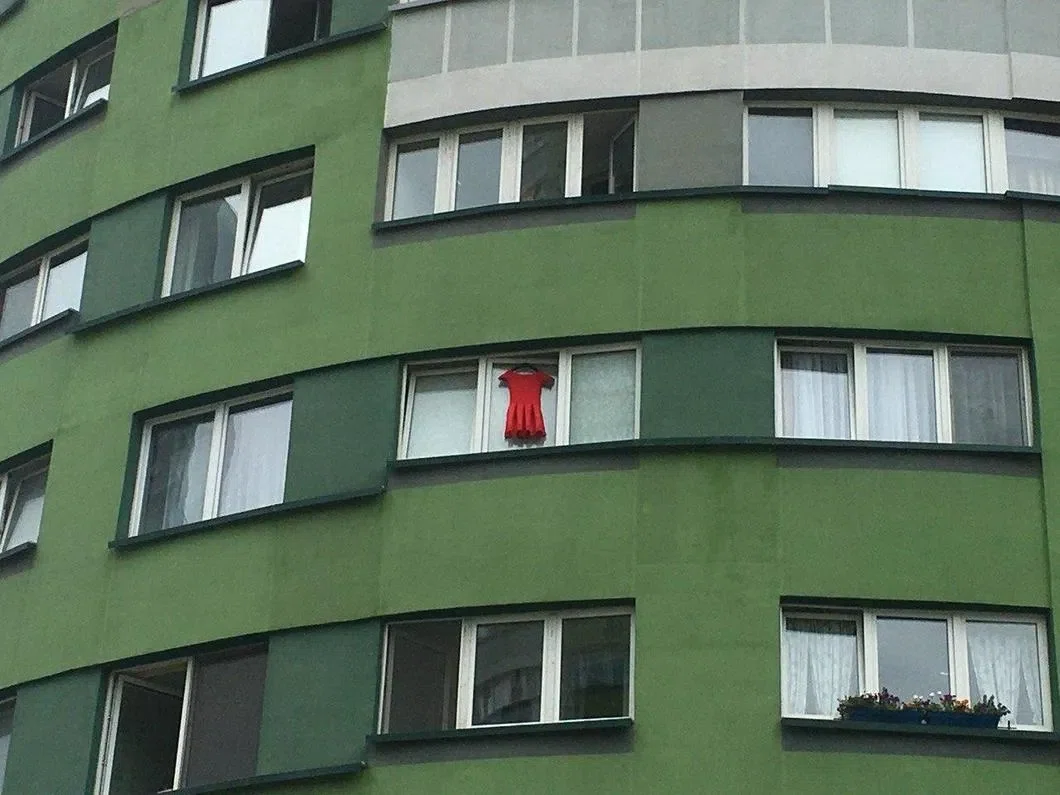 Не поверив, я зашла в «Искусницу» на проспекте Независимости. Там действительно не было красной и белой ткани. В окне жилого комплекса «Каскад» я видела остроумное решение проблемы: кто-то закрыл белые шторы в комнате, а снаружи, как раз посередине, вывесил красное платьице.