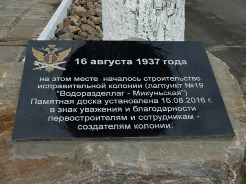 Четыре года назад, 16 августа, в поселке Микунь близ Сыктывкара открыли странный памятный знак. У входа в женскую колонию № 31 установили мемориальную доску в честь (sic!) 79-летия начала строительства гулаговского лагпункта № 19 «Водоразделлаг — Микуньская». На мраморной плите высечено: «Доска установлена в знак уважения и благодарности первостроителям и сотрудникам — создателям колонии».