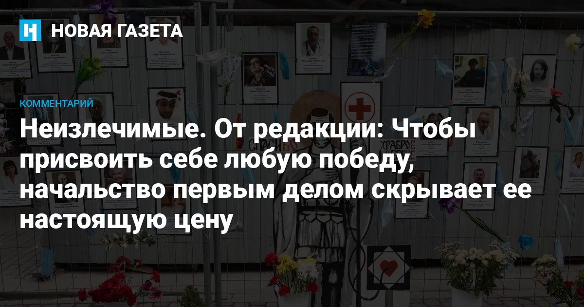 Но у победы всегда есть настоящая цена, и она выражается в человеческих жизнях. На войне — это жизни солдат. Сегодня — жизни врачей. Они приняли на себя первый удар, как армия в 1941 году, не имея в достатке ни нужных лекарств и оборудования, ни средств и способов защиты себя. Выстояли. Родина сказала спасибо — и по традиции соорудила «братскую могилу». Чтобы за постаментом, к которому в урочный час можно принести венки, не было видно даже точного числа погибших, не то что их имен и лиц.