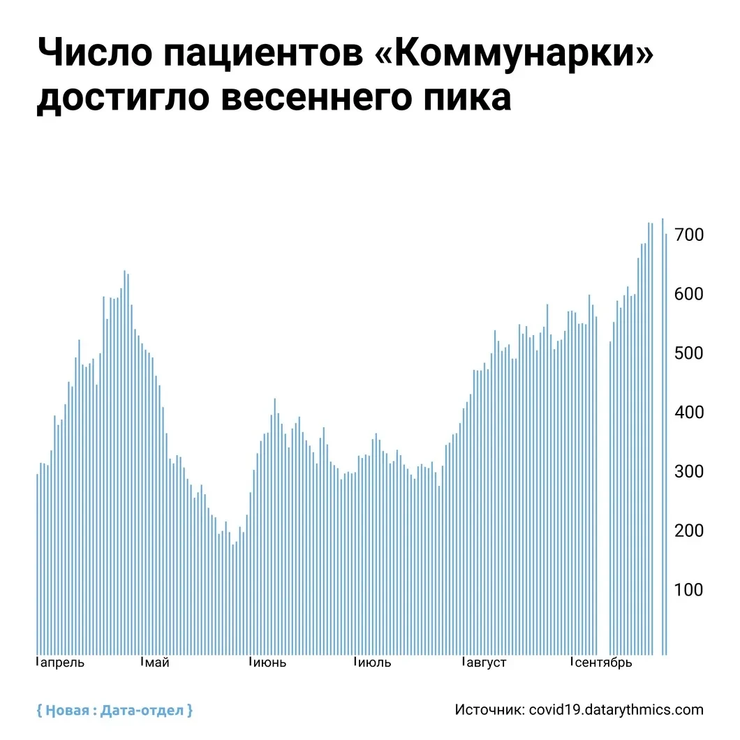 В Москве, как и во всем мире, растет число новых случаев коронавируса. В Бельгии рост заражений составил 40%, а в Оттаве сентябрьские показатели соизмеримы с апрельскими.Московские власти не публикуют общее число госпитализированных пациентов с коронавирусом, однако несколько столичных больниц каждый день отчитываются о поступлении больных в социальных сетях. Последние несколько дней число госпитализированных появляется и в сообщениях московского оперштаба. Эти данные показывают, что количество больных с COVID-19 и внебольничной пневмонией действительно выросло: если в августе на лечении в больнице в Коммунарке в среднем находилось около 500 человек, то сейчас — более 700.