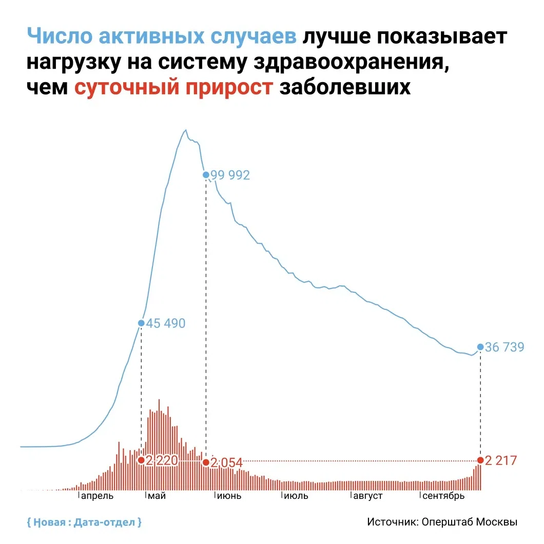 Несмотря на то что число новых случаев вернулось к майским значениям, ситуация в городе пока не так плоха, как весной. В конце мая число активных случаев — всех, кто болеет в данный момент, — было в два с половиной раза больше, чем сегодня. Это может говорить о том, что нагрузка на систему здравоохранения не так высока и в Москве еще есть свободные мощности для лечения коронавирусных больных.