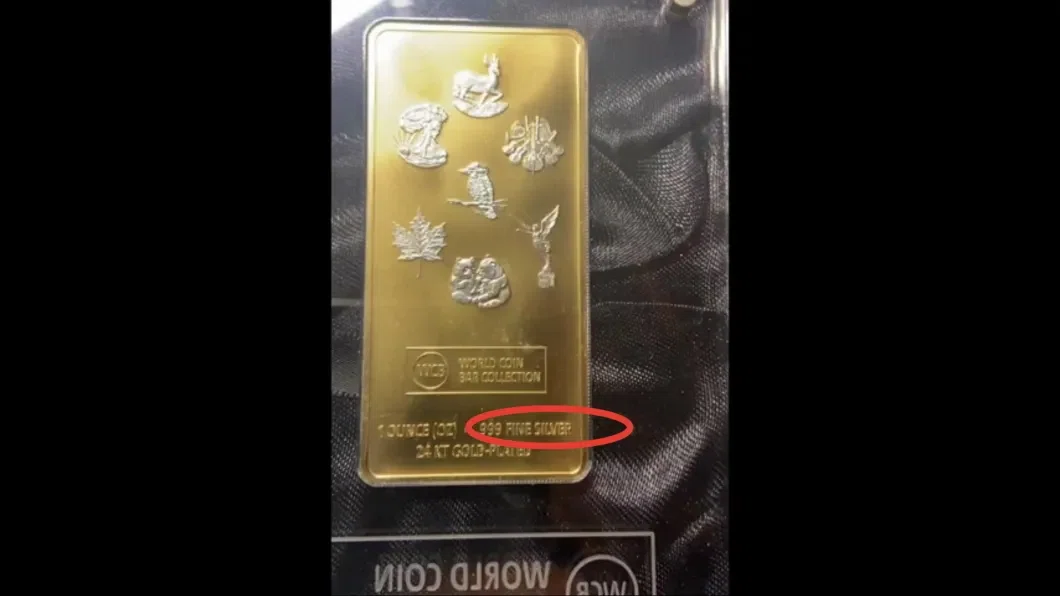 В подтверждение преступного обогащения подозреваемых полиция показывает один из будто бы изъятых у них золотых слитков. Но если присмотреться, то на предмете желтого цвета написано: 999 fine silver (серебро. — Ред.).