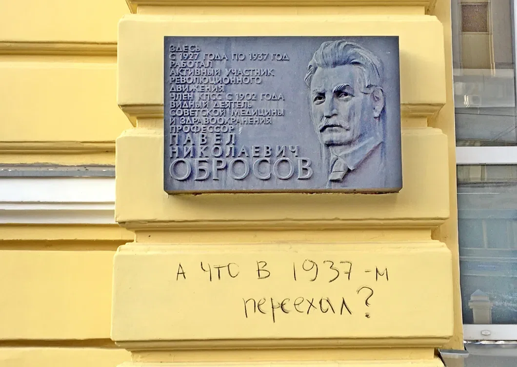 Мемориальная доска профессору Павлу Обросову. Директор института Склифософского Павел Обросов был арестован в 1937 году и расстрелян на полигоне «Коммунарка»