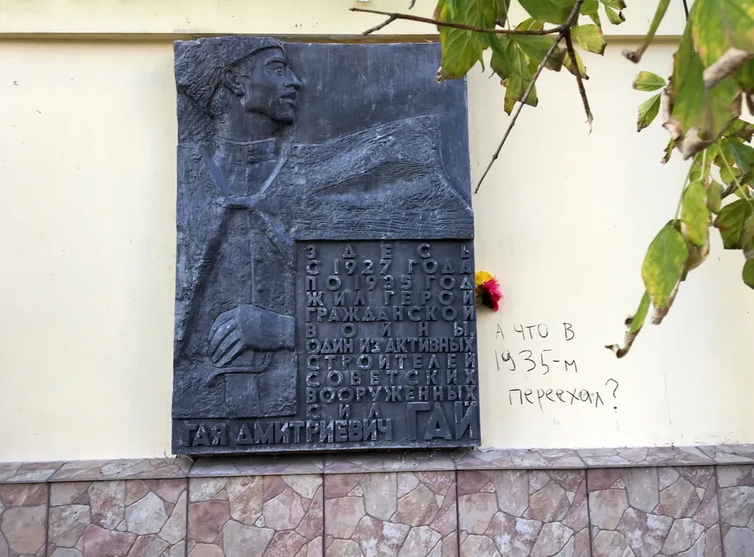 Мемориальная доска Гая Гаю. Гай сделал стремительную военную карьеру, но был обвинен в «создании военно-фашистской организации в Красной армии» и арестован. Пытался бежать из-под конвоя, но получил ранение. После двухлетней отсидки был расстрелян, попав под кампанию массовых чисток в Красной армии