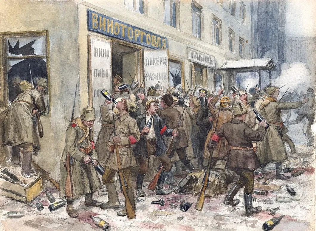 «Разграбление винной лавки революционными рабочимии солдатами в Петрограде, январь 1919 г.». Архив и библиотека Гуверовского института (США)