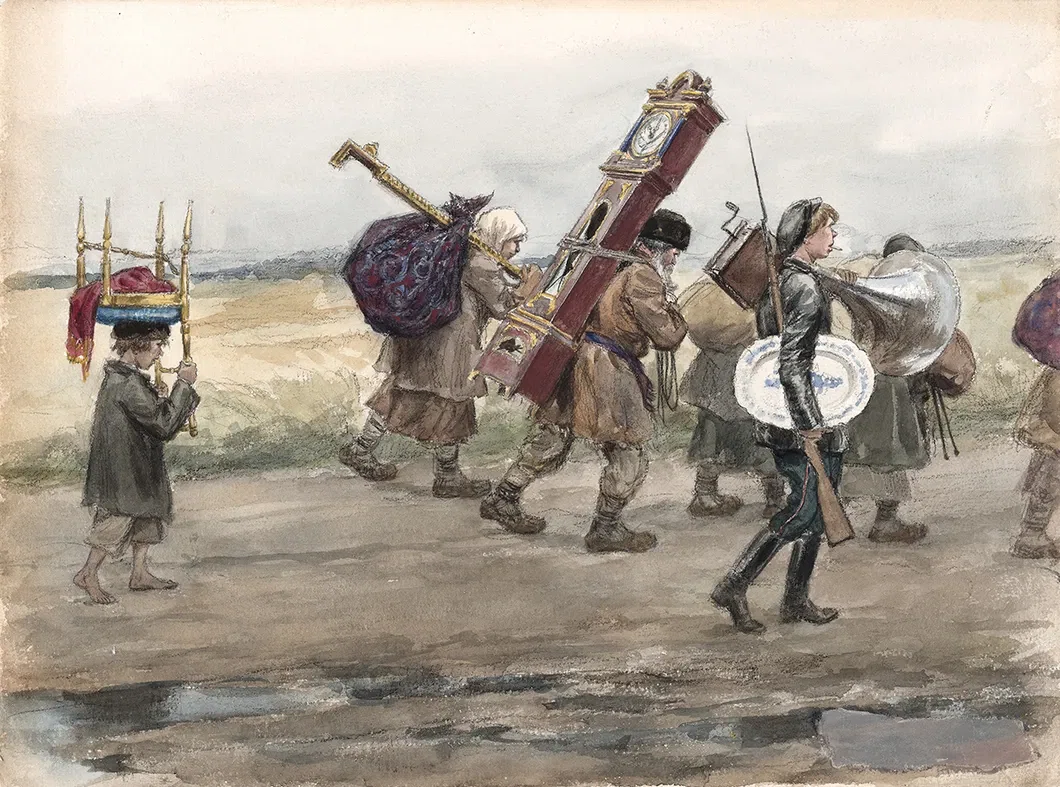 «Крестьяне возвращаются домой после разграбления барской усадьбы в окрестностях Пскова, 1919г.» Архив и библиотека Гуверовского института (США)