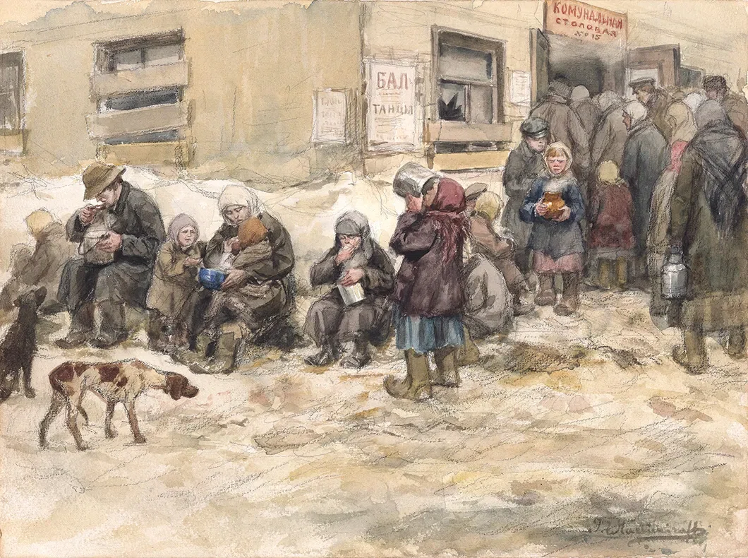 «Голодные дни в Петрограде. Голодающие из разных сословий со своими порциями [супа] у “коммунальной столовой”, 1919 г.». Архив и библиотека Гуверовского института (США)