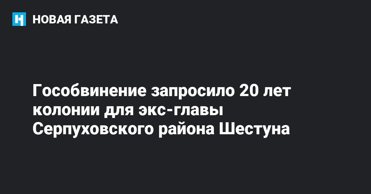 Прокуратура попросила приговорить бывшего главу Серпуховского района Подмосковья Александра Шестуна к 20 годам колонии строгого режима. Об этом «Новой газете» сообщила председатель общественного комитета «Свободу Шестуну» Влада Русина.
