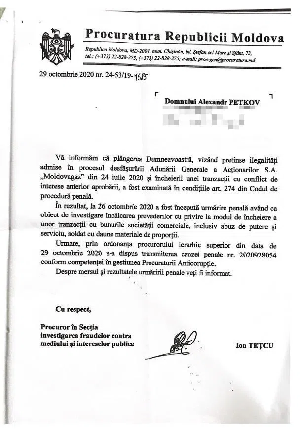 Из ответа следует, что 26 октября прокуратура Молдовы по борьбе с коррупцией (есть и такая!) возбудила уголовное дело № 2020928054 по факту «возможных незаконных действий в ходе общего собрания акционеров АО «Молдовагаз» от 24 июля 2020 года и заключения сделки с конфликтом интересов».
