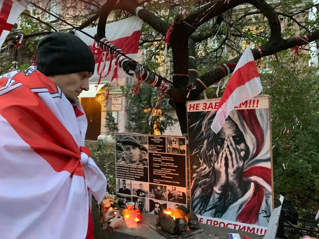 Стихийный мемориал появился 12 ноября, когда стало известно об очередном замученном, — Романе Бондаренко. На следующее утро ни свечей, ни цветов на месте уже не было: посольские, пользуясь тем, что на ночь на вахте никто не остался, зачистили «мусор»… Теперь вахтовики дежурят по очереди, круглосуточно.