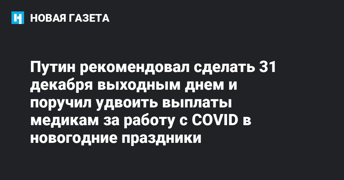 Президент также поручил удвоить дополнительные выплаты медикам за работу с пациентами с коронавирусом в новогодние праздники.