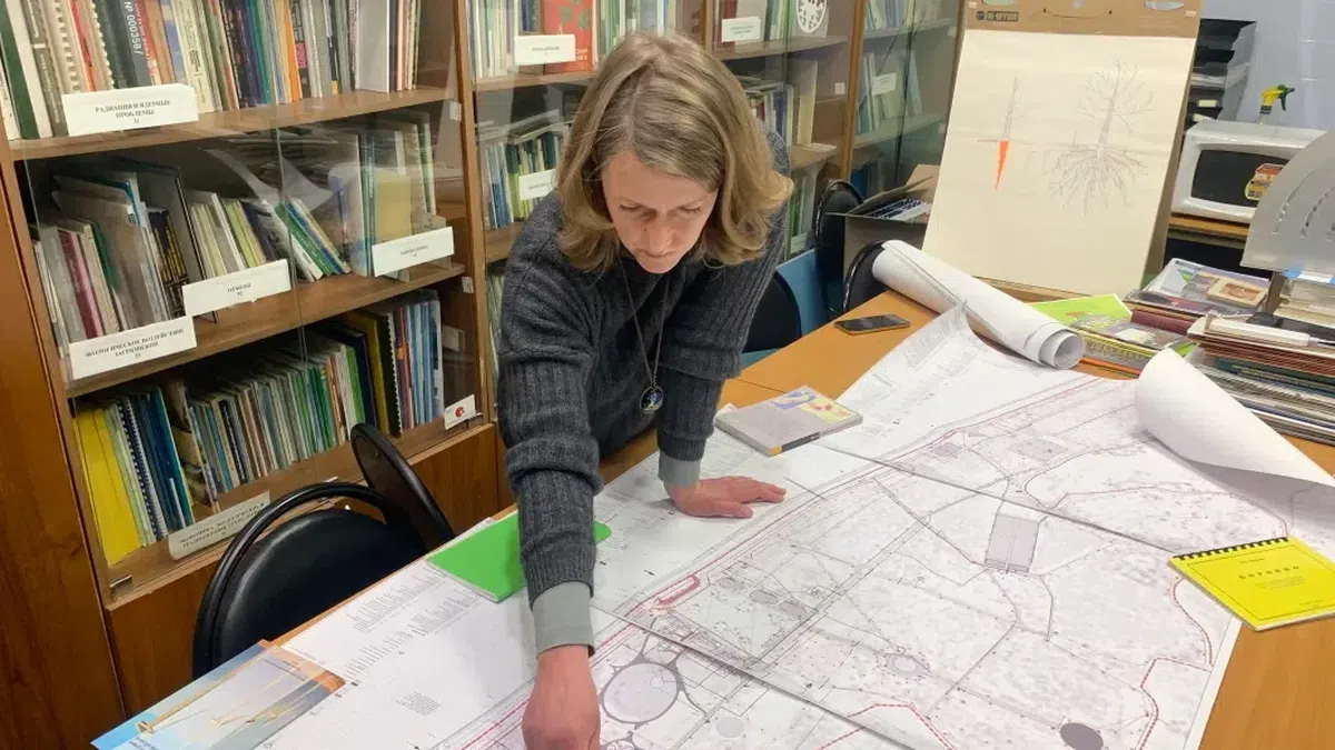 Елена Латышева над картой парка «Швейцария». Фото: Иван Жилин / «Новая газета»