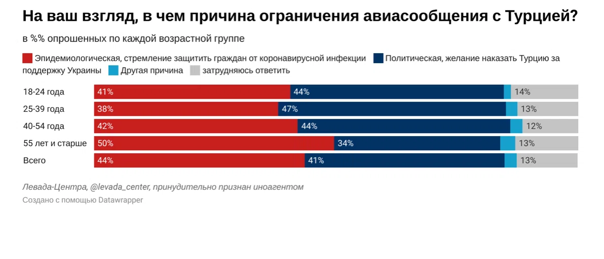 Как отмечает «Левада», 44% россиян считают, что причина ограничения авиасообщения заключается в стремлении защитить граждан от коронавирусной инфекции. 13% затруднились ответить на этот вопрос. По данным соцопроса, точка зрения об «эпидемиологической» причине более популярна в старших группах респондентов: 50% среди опрошенных — 55 лет и старше. В молодых группах респондентов более популярна точка зрения о «политических» причинах ограничения: 44% среди опрошенных —в возрасте 18-24 лет, 47% — среди опрошенных 25-39 лет.