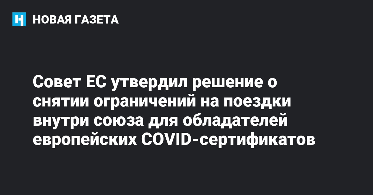 «Владельцы сертификатов вакцинации, выданных в соответствии с правилами ЕС о цифровых COVID-сертификатах, не будут обязаны проходить тест на коронавирус или отправляться отбывать карантин / на самоизоляцию, если они полностью вакцинированы препаратом, одобренным EMA, и с момента полной вакцинации прошло не менее 14 дней», — говорится в решении Совета ЕС.