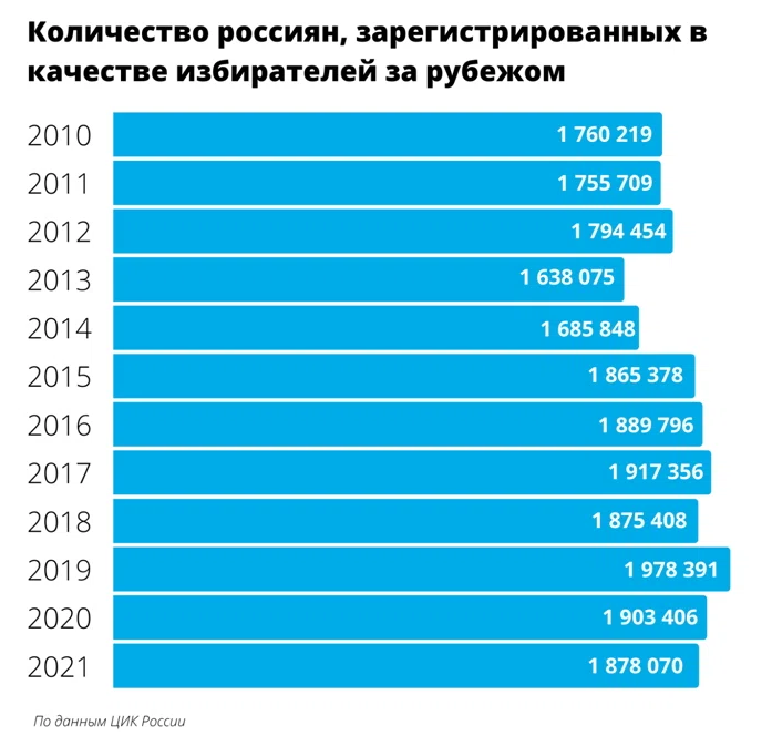 По данным ЦИК, в начале 2021 года за рубежом было зарегистрировано более 1,8 миллиона избирателей.
