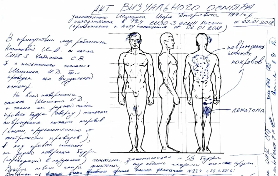 Фиксация повреждений на теле Игоря Шишкина. Рисунок из акта членов ОНК Петербурга