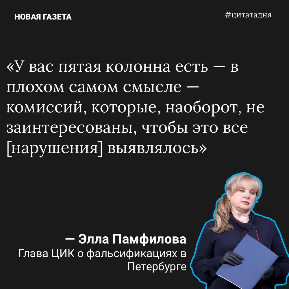 Глава ЦИК Элла Памфилова заявила, что вбросами «пытаются обозвать элементарное голосование людей, которые получают до девяти бюллетеней». Она рассказала, что с трудом положила в урну четыре бюллетеня, когда голосовала сама. Также Памфилова считает, что в Петербурге действует «пятая колонна», которая препятствует выявлению нарушений на выборах.