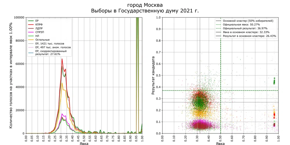Как можно предположить на основании опыта наблюдателей и анализа прошлых выборов, именно «главному ядру» в правой панели (и первому пику в распределении голосов в левой панели) соответствуют нефальсифицированные участки, а рассеянный