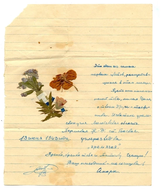 Это одни из самых первых цветов, распустившихся в этом месяце. Пусть они напоминают тебе, милая Цыля, о твоем друге-таежнике. Искателе уралького угля. Молотовская область. Пермская Ж-Д. ст. Баская.