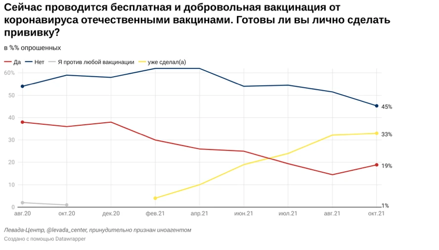 Социологи отметили рост готовых привиться от коронавируса с 15% — в августе до 19% — в октябре. . Доля тех, кто не готов привиться, сокращается (52% — в августе, 45% — в октябре). Примерно треть респондентов (33%) ответили, что уже сделали прививку.