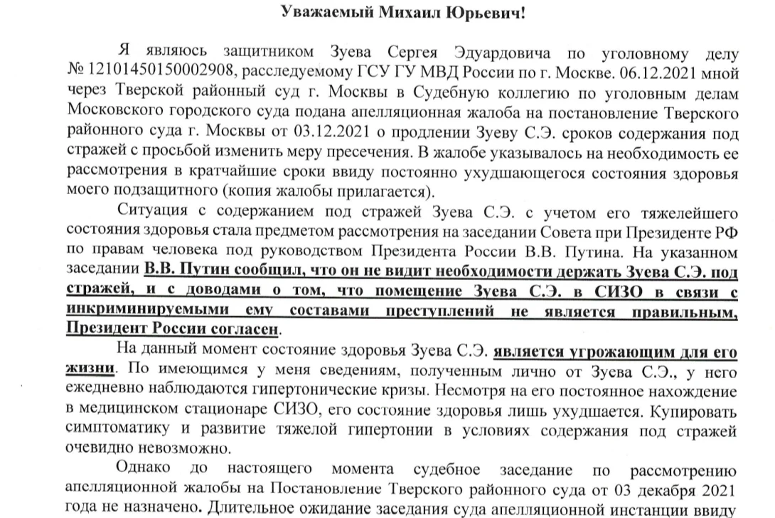 «На данный момент состояние здоровья Зуева С.Э. Является угрожающим для его жизни. <…> Длительное ожидание заседания суда апелляционной инстанции ввиду невозможности оказания в СИЗО должной медицинской помощи может привести к непоправимым последствиям», — говорится в обращении.