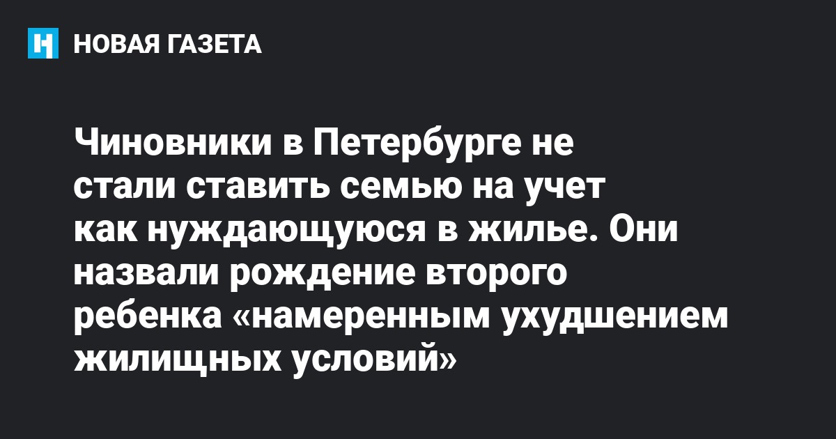Сотрудники одной из районных администраций в Петербурге назвали рождение в семье второго ребенка «намеренным ухудшением жилищных условий» и отказали ей в постановке на учет как нуждающейся в жилье. Об этом сообщается на сайте уполномоченного по правам человека в Петербурге Светланы Агапитовой.