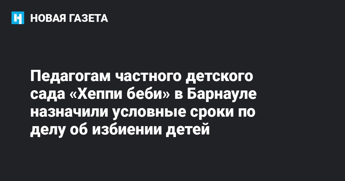 Центральный районный суд Барнаула приговорил заведующую частного детского сада «Хеппи беби» и четырех воспитателей к срокам от 3 до 5 лет лишения свободы условно по делу о избиении детей. Об этом сообщается на сайте СУ СК по Алтайскому краю.