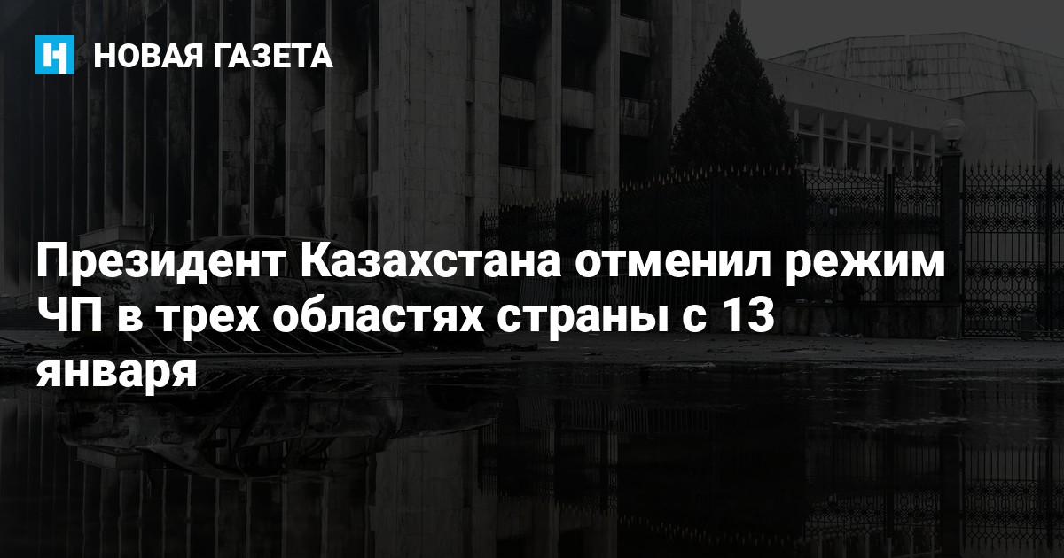 Президент Казахстана Касым-Жомарт Токаев отменил режим чрезвычайного положения (ЧП) в Западно-Казахстанской, Северо-Казахстанской и Павлодарской областях с 13 января. Соответствующие постановления опубликованы на официальном сайте президента.