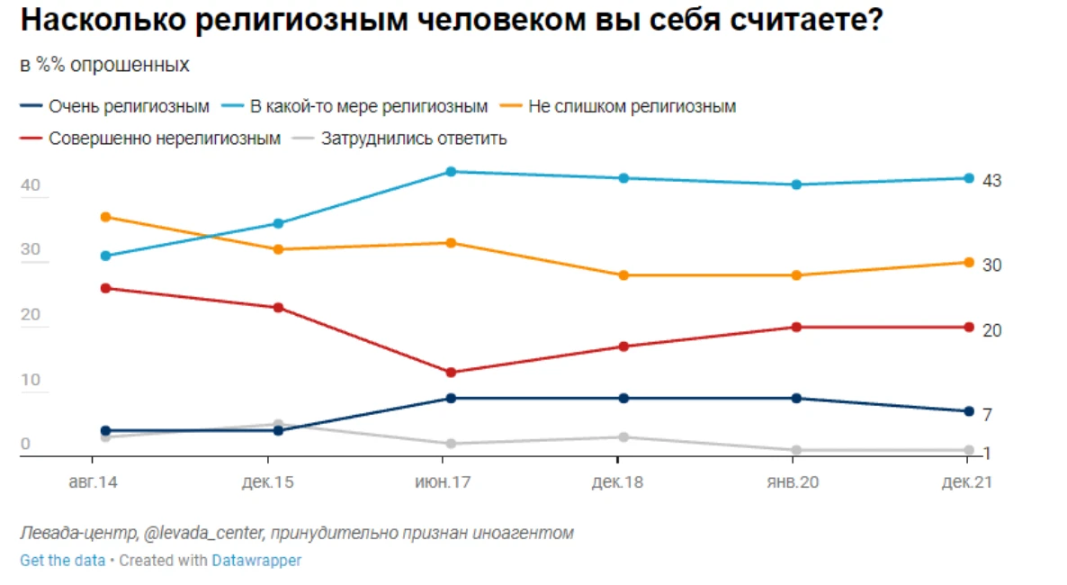 В то же время опрос «Левада-центра» показал, что половина россиян определяют себя как религиозных людей. Из них 7% жителей страны считают себя очень религиозными, 43% — в какой-то мере религиозными. Социологи отмечают, что этот показатель остается без значительных изменений с июня 2017 года.