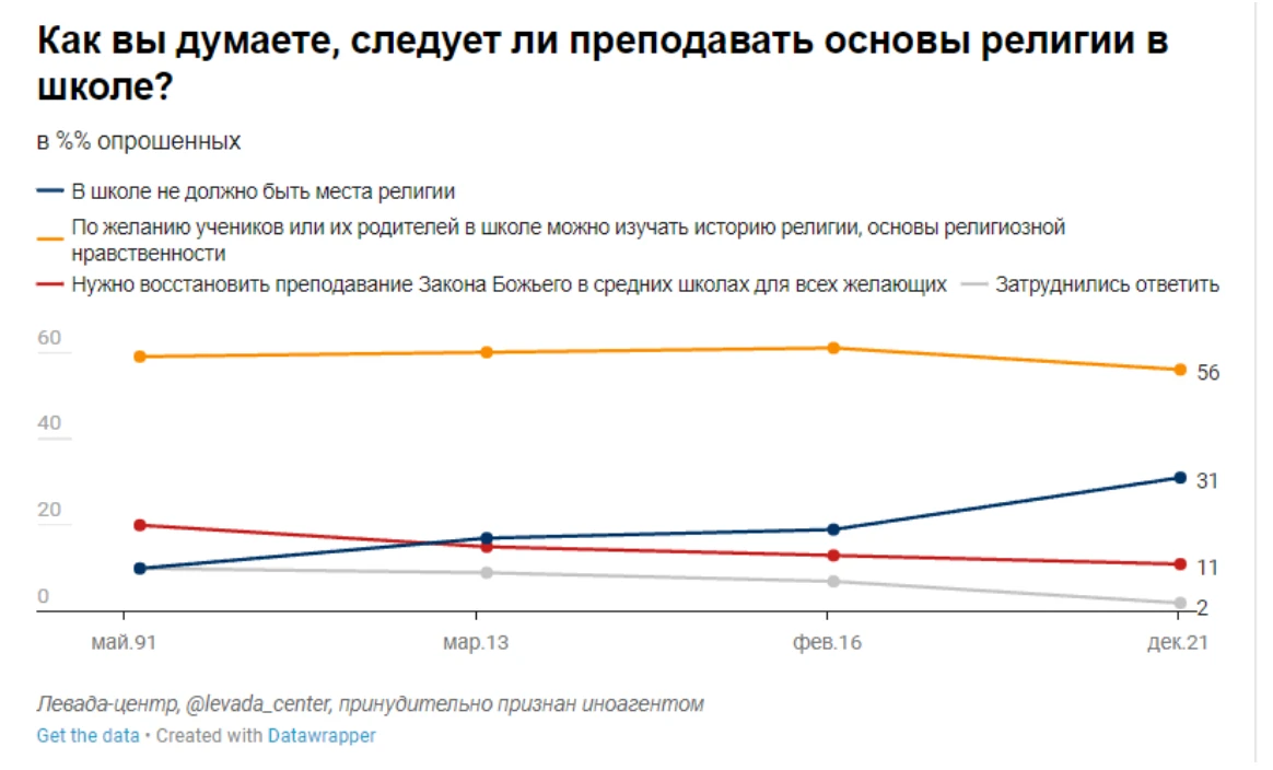 Треть россиян (31%) считают, что религии не должно быть в школе. Этот показатель вырос на 12 п.п. по сравнению с февралем 2016 года, следует из данных опроса «Левада-центра»* (есть в распоряжении «Новой газеты»).
