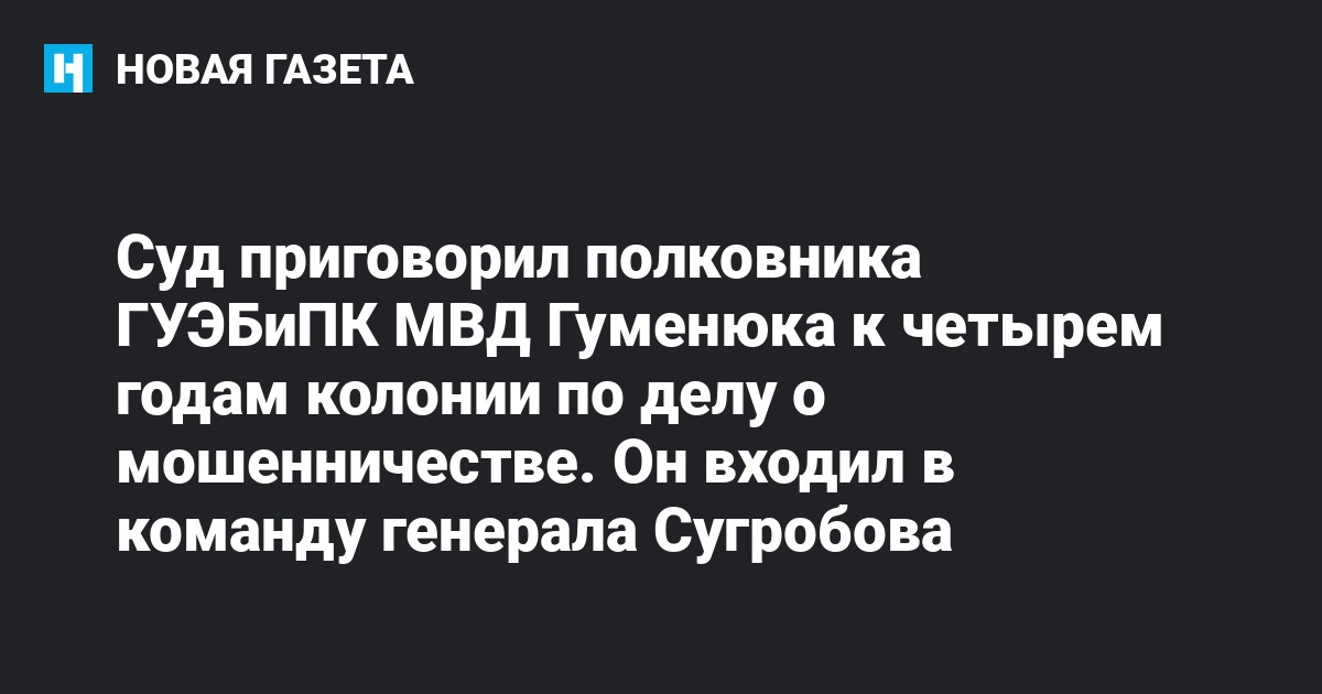 Савеловский суд Москвы приговорил полковника главного управления экономической безопасности и противодействия коррупции (ГУЭБиПК) МВД Бориса Гуменюка к четырем годам лишения свободы по делу о мошенничестве в особо крупном размере (ч. 3 ст. 30 и ч. 4 ст. 159 УК). Об этом сообщает «Коммерсант» со ссылкой на материалы суда.