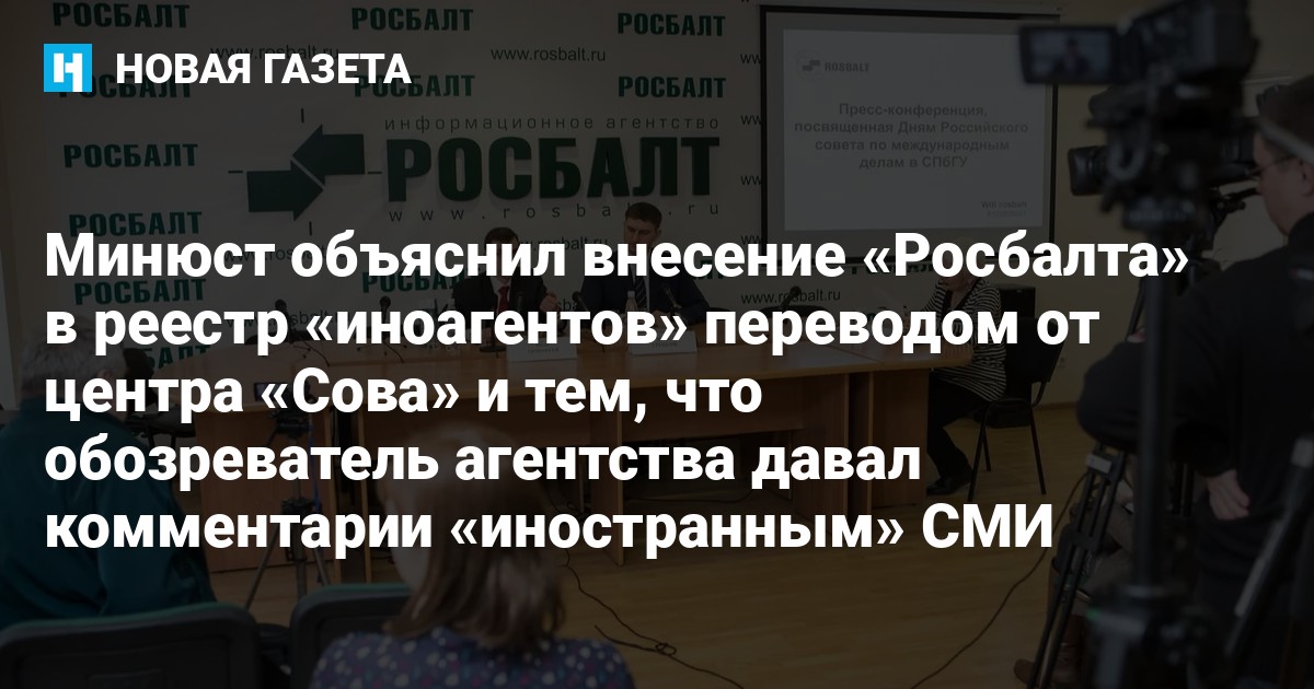 «Из Росфинмониторинга в Минюст России поступила информация о том, что [«Росбалтом»] получено иностранное финансирование в январе 2020 года от РОО Центр «Сова», включенной в реестр НКО, выполняющих функции иностранного агента, получена сумма за организацию конференции. РОО Центр «Сова» является получателем денежных средств от иностранных источников», — говорится в решении.