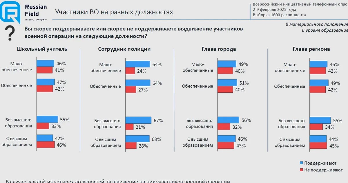 «Новая газета», ознакомившись с исследованием, обратила внимание на один из слайдов — с вопросом: поддерживаете вы или нет выдвижение участников военной операции на должности школьного учителя, полицейского, главы города или главы региона?