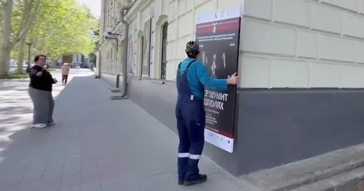 С театра в Севастополе снимают афиши спектаклей театра Вахтангова, прихавшего с гастролями. Скриншот